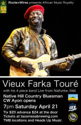 In 2013, Vieux Farka Touré’s beautiful and critically acclaimed latest album Mon Pays was released as an homage to his homeland. Being that his native Mali had recently been splintered by territorial fighting between Tuareg and Islamic rebels since January 2012, Mon Pays was devoted to reminding the world about the beauty and culture of his native Mali. Translated as ‘My Country,’ this predominantly acoustic undertaking transformed into an artifact of cultural preservation. Two songs on the project -Future’ and ‘Peace’ feature Sidiki Diabate’s kora leading an emotional charge complemented by Touré’s spectacular guitar work. Both tracks represent an important generational “passing of the torch” as Sidiki’s father, Toumani is considered one of the greatest living kora masters and was a close friend of Vieux’s father Ali. Mon Pays has been widely hailed as the most mature and lovely record yet from one of this generation’s most exciting artists to come out of Mali and one of world music’s true rising stars.