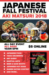 Celebrate the NMJACL’s annual fall festival Aki Matsuri on Sunday, September 23rd featuring Japanese cultural exhibits, vendor fair, musical demonstrations, Japanese art, Japanese food, Beer and Sake tastings and more!