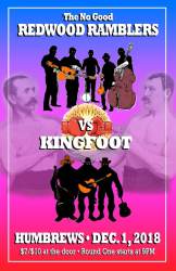 Humboldt's favorite string-bands are facing off for an epic night of stomping and hooting and hollering! The No Good Redwood Ramblers have been bringing their unique brand of Bluegrass-Pop to the West Coast for 10 years. Don't miss this rare show on their home turf! Locally-sourced and dance-worthy string band Kingfoot opens the show at 9:00!