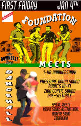Pressure Down Sounds and Rudies Hi-Fi spin strictly-vinyl all-night reggae grooves for First Friday at Downbeat Lounge. Vintage wax mixes of dancehall, ska, rocksteady and more by selectors Zion Coptic Sounds and Irie-Sistable.