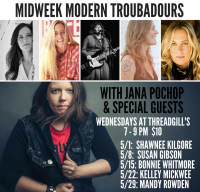 Join us for our new Wednesday night music series, Midweek Modern Troubadours, featuring Jana Pochop with special guests. This week's guest is Susan Gibson, a dedicated singer, songwriter, and performing musician. She's also a CMA award-winning songwriter (the Dixie Chicks took the Gibson-penned "Wide Open Spaces" to the top for four weeks).
