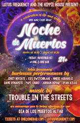 :: Lotus Frequency cordially invites you to share in our celebration of life and death, as we remember those who have passed and assist them on their spiritual journey. We'll be celebrating with them by dedicating some very special burlesque, contortion, and pole performances, as well as two unique performances from none other than Trouble in The Streets singer, Nnedi Nebula Agbaroji!