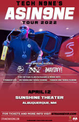 TECH N9NE * Joey Cool * X-Raided * Mayday ASIN9NE Tour 2022 Tuesday, April 12, 2022 Doors 7pm | Show 8pm Sunshine Theater ABQ NM all ages Advance tickets - $35 + service charge