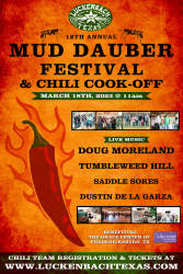 The Mud Dauber Chili Cook-Off March 18th! The Best Dance Music and a return to our Chili Cook-Off Roots (Luckenbach and Terlingua are synonymous) Get your team together and get ready to take the Luckenbach GOLD 1st place winner will receive a $500 cash prize !! $5 Chili tasting kit Sold On-Site Only - Benefiting The Grace Center of Fredericksburg, Texas. The Return of the Mud Dauber is also celebrated as Luckenbach has the best MUD in the Universe!