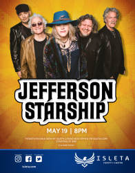 Jefferson Starship’s five members describe themselves as both a “family” and a “gang,” and that comes across in talking to them, and in their robust live performances, which have taken them to all 50 U.S. states., five continents, and too many countries to list here (a recent tour of New Zealand was mentioned among the band’s favorites), drawing from a massive setlist of hit after hit.
