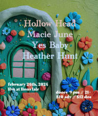 21+ $12 Doors $10 Adv Doors 9:00PM Show 9:30PM ________________________ Hollow Head - denver rock https://www.facebook.com/hollowheadmusic Macie June - Yes Baby - Heather Hunt -