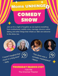Join us for a night of laughter as we explore everything from motherhood, midlife crisis, marriage, divorce, online dating, and other things that irritate us. Men are welcome to the show, too.
