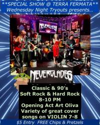 $5 Cover. ART OLIVA DOES ALL KINDS OF COVER SONGS ON VIOLIN - SO COOL! 7 TO 8. THEN 8 - 10, ROCK BAND NEVERGLADES TAKES THE STAGE - Classic & 90s / Alternative Rock - So good, female lead singer... full band - THIS WILL BE A NIGHT OF EXCEPTIONALLY GOOD MUSIC for just $5 cover and you get Free Chips and Pretzels - THANKS FOR SHARING THE EVENT we appreciate it! Hosted by Priscilla Speicher Music & Events by Priscilla