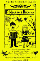 A Hawk and A Hacksaw began in Saumur, France, in 2002, by Jeremy Barnes, the drummer of Neutral Milk Hotel, who, having burnt out on playing drums, picked up the accordion and became obsessed with folk music from Romania, Hungary, the former Yugoslavia, and Turkey. In 2004 Barnes moved home to New Mexico, and met his partner in life and music, violinist Heather Trost. Their first conversation was about the Hungarian composer Bela Bartok. The pair toured extensively in the U.S. and Europe, and eventually further afield, to Brazil, Turkey, Australia, Japan. They released a good amount of recordings in an era when CDs were sold at shows and one could carry a large amount of them in carry on luggage. In 2005, they helped a fellow native New Mexican, Zach Condon get a record deal, and played on his debut album. He named his project Beirut. That same year, Barnes traveled to the far Northeast of Romania, to the Roma (gypsy) village of Zece Prajini, where he recorded with the brass band Fanfare Ciocarlia. Barnes and Trost moved to Hungary in 2006 and worked extensively with four Hungarian folk group The Hun Hangar Ensemble. They moved back to New Mexico in late 2008 and continued touring, working with a variety of musicians from different parts of Europe and the U.S. In 2011 and 2012, they toured cinemas with a new soundtrack to Sergei Parajanov’s classic film “Shadows of Forgotten Ancestors.” Barnes and Trost began releasing their own records and releases from around the world on their label Living Music Duplication around this time. In 2015, they worked with the BBC Concert Orchestra and the Berlin based classical ensemble Stargaze on larger orchestrations of their music, and they curated the Transmissions festival in Ravenna, Italy.