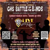 The Golden High School Performing Arts Boosters proudly presents the 2nd Annual GHS Battle of the Bands. This unique community event will feature not only student bands, but a GHS staff band as well! Come watch your favorite rock-playing teachers on stage!