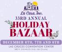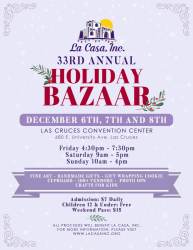 We are excited to announce that The La Casa, Inc. Holiday Bazaar is celebrating its 33rd year! This year, the Holiday Bazaar will be held on Friday, December 6th, from 4:30 pm - 7:30 pm, Saturday, December 7th, from 9:00 am - 5:00 pm, and Sunday, December 8th, from 10:00 am to 4:00 pm. Join us for a cherished tradition that brings our community together for a delightful shopping experience, all in support of a great cause.